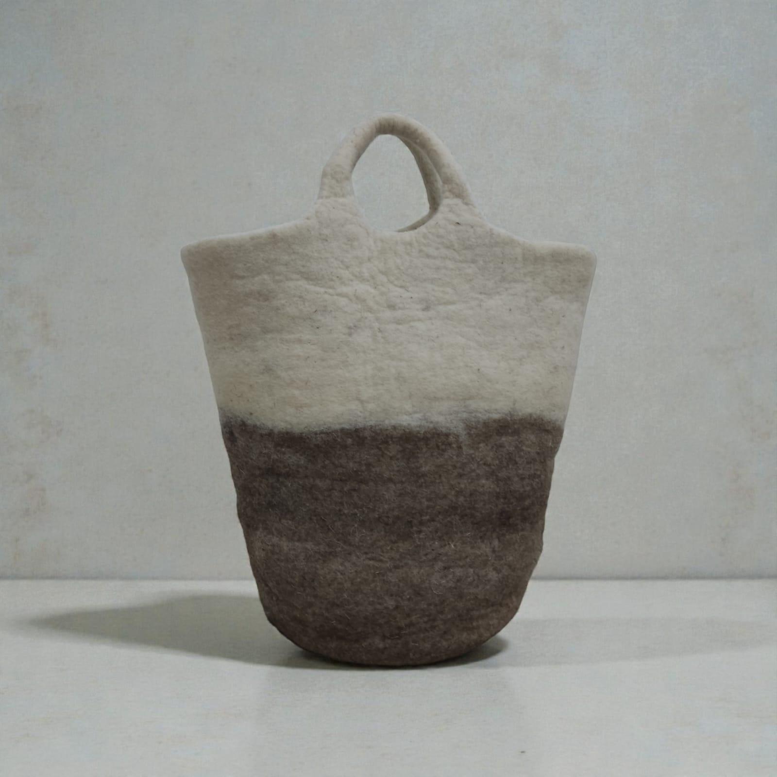Panier de rangement en laine feutrée naturelle, réalisé à la main avec un élégant dégradé blanc et grège. Raffiné et fonctionnel, il apporte une touche chaleureuse et haut de gamme à votre quotidien tout en offrant un rangement pratique et esthétique.