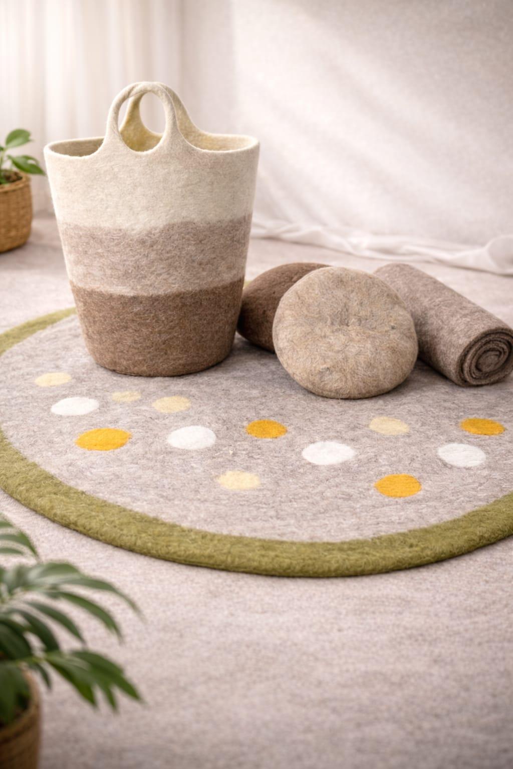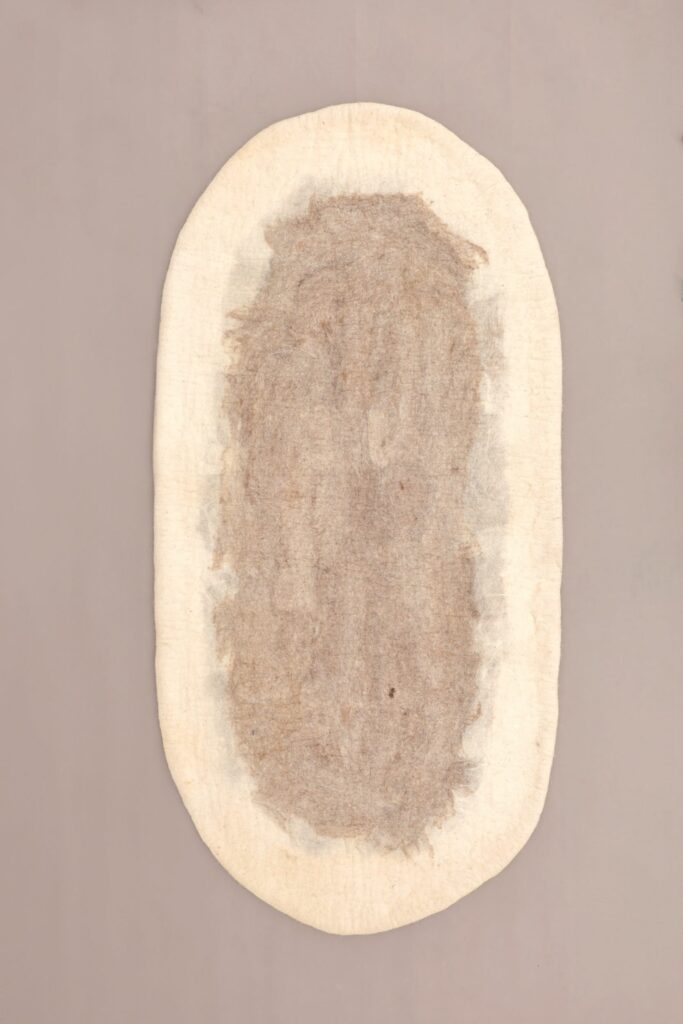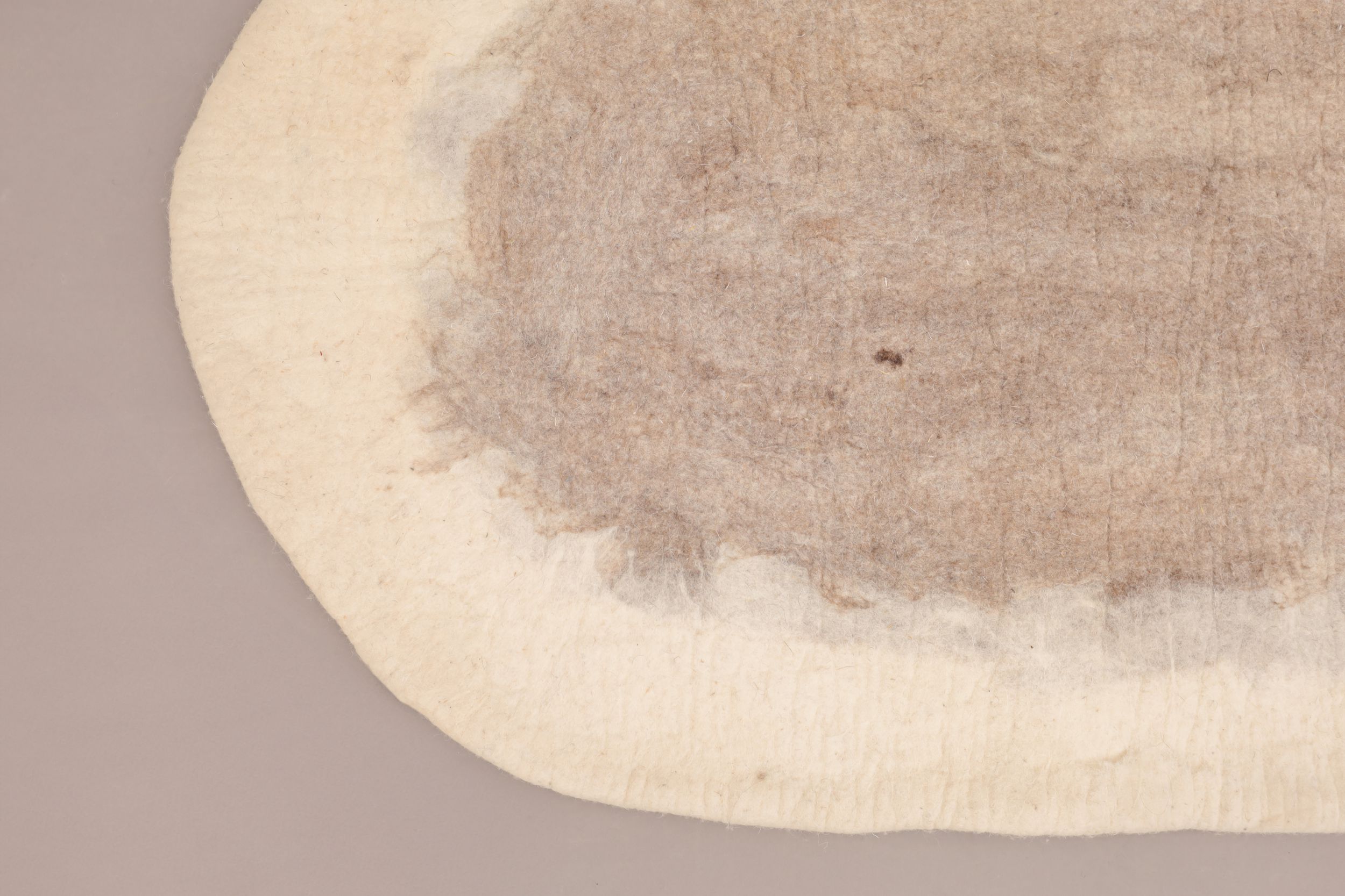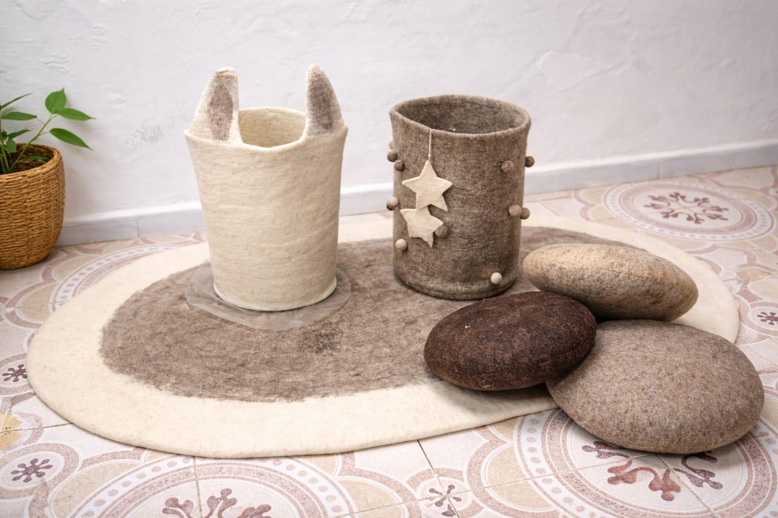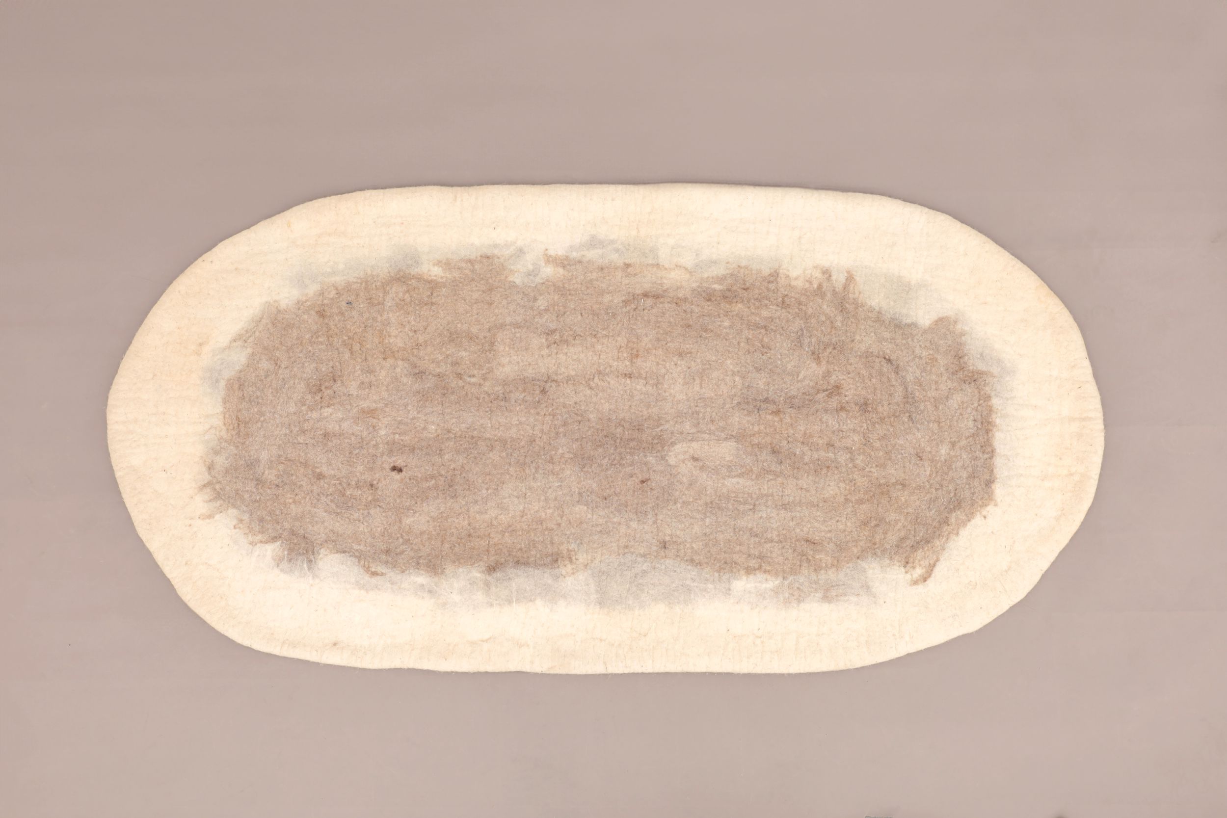Tapis ovale en laine feutrée naturelle, idéal pour le salon et la chambre à coucher. Doux, chaleureux et élégant, il apporte confort et style à votre intérieur avec une touche artisanale raffinée.