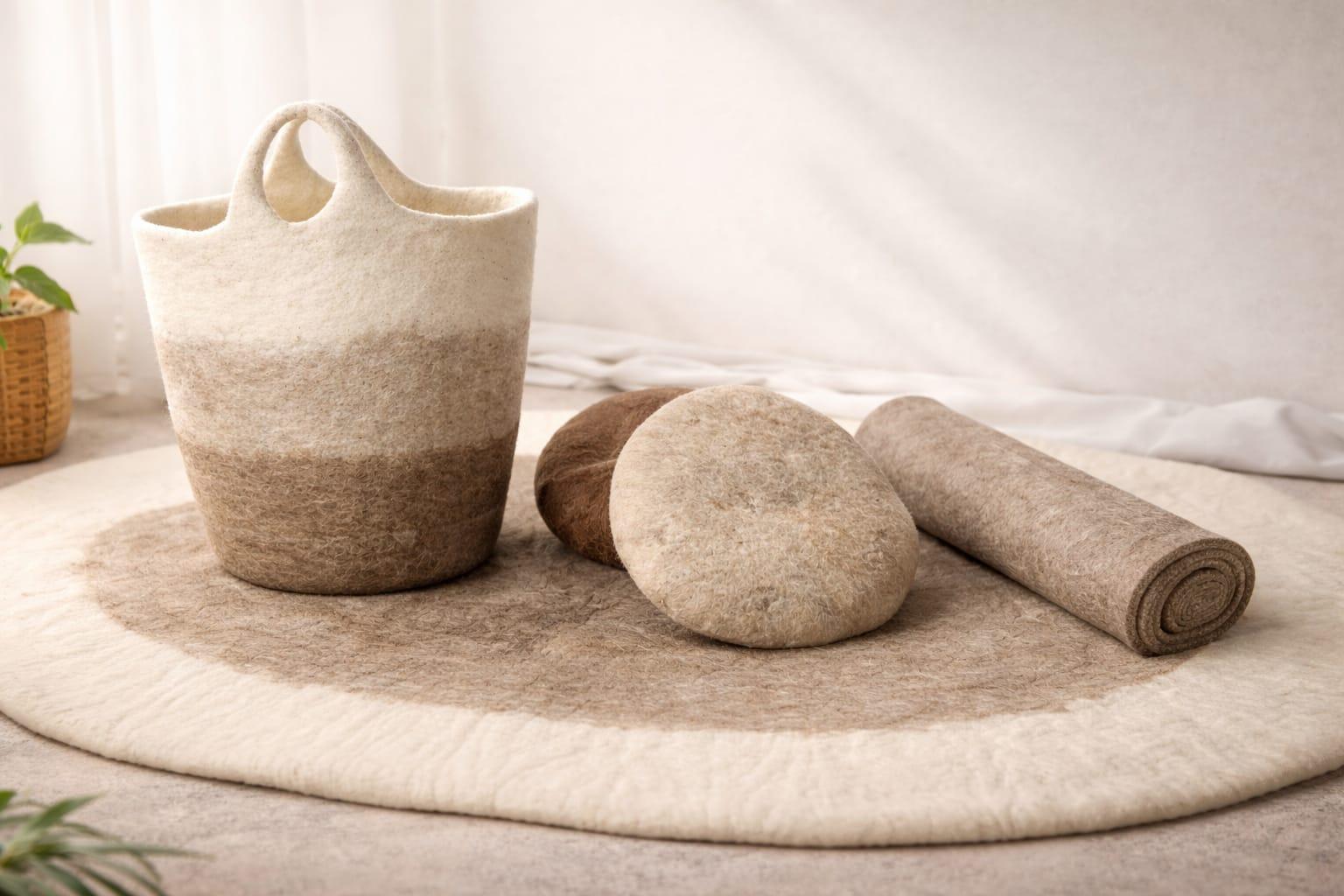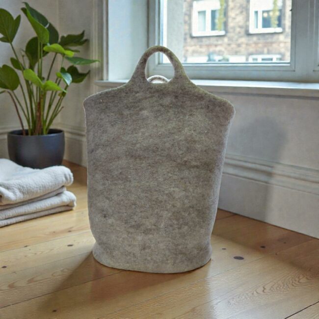 Panier de rangement décoratif en laine feutrée grège, fabriqué à la main avec soin. Doux et chaleureux, il apporte une touche intime et élégante à votre intérieur, alliant esthétique et praticité pour organiser vos affaires quotidiennes avec style et naturel.